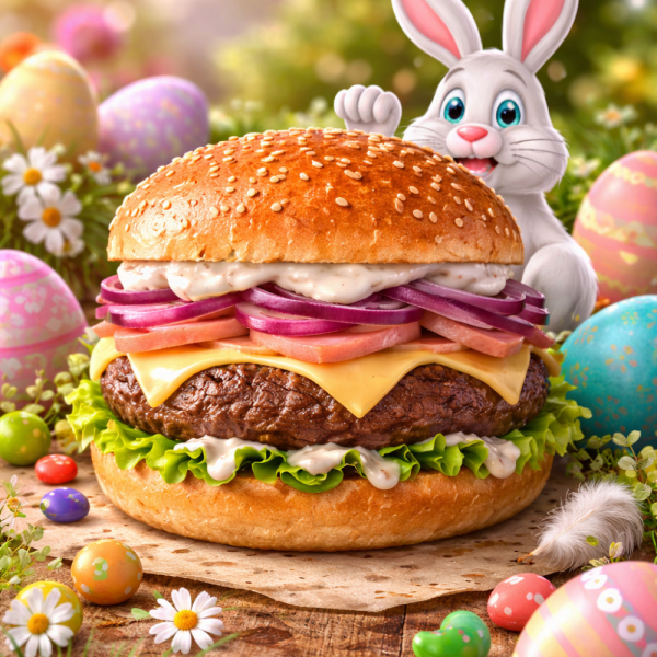 buci, húspogácsa, sonka, fejes saláta, kígyóuborka, tv paprika, gomba, tejföl, lapkasajt választható öntettel