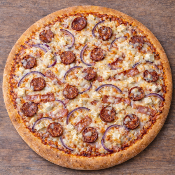 pizzaszósz, sonka, kolbász, szalámi, császárszalonna, húspogácsa, trappista sajt - 26 cm
